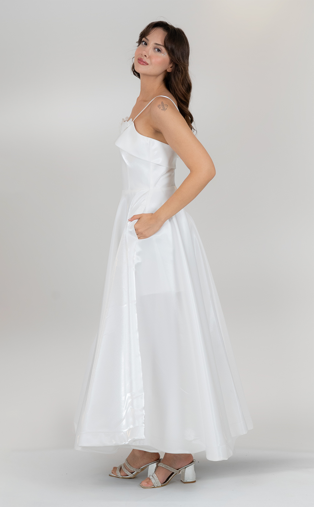 İnce Askılı Çiçek Detaylı Beyaz Midi Boy Abiye