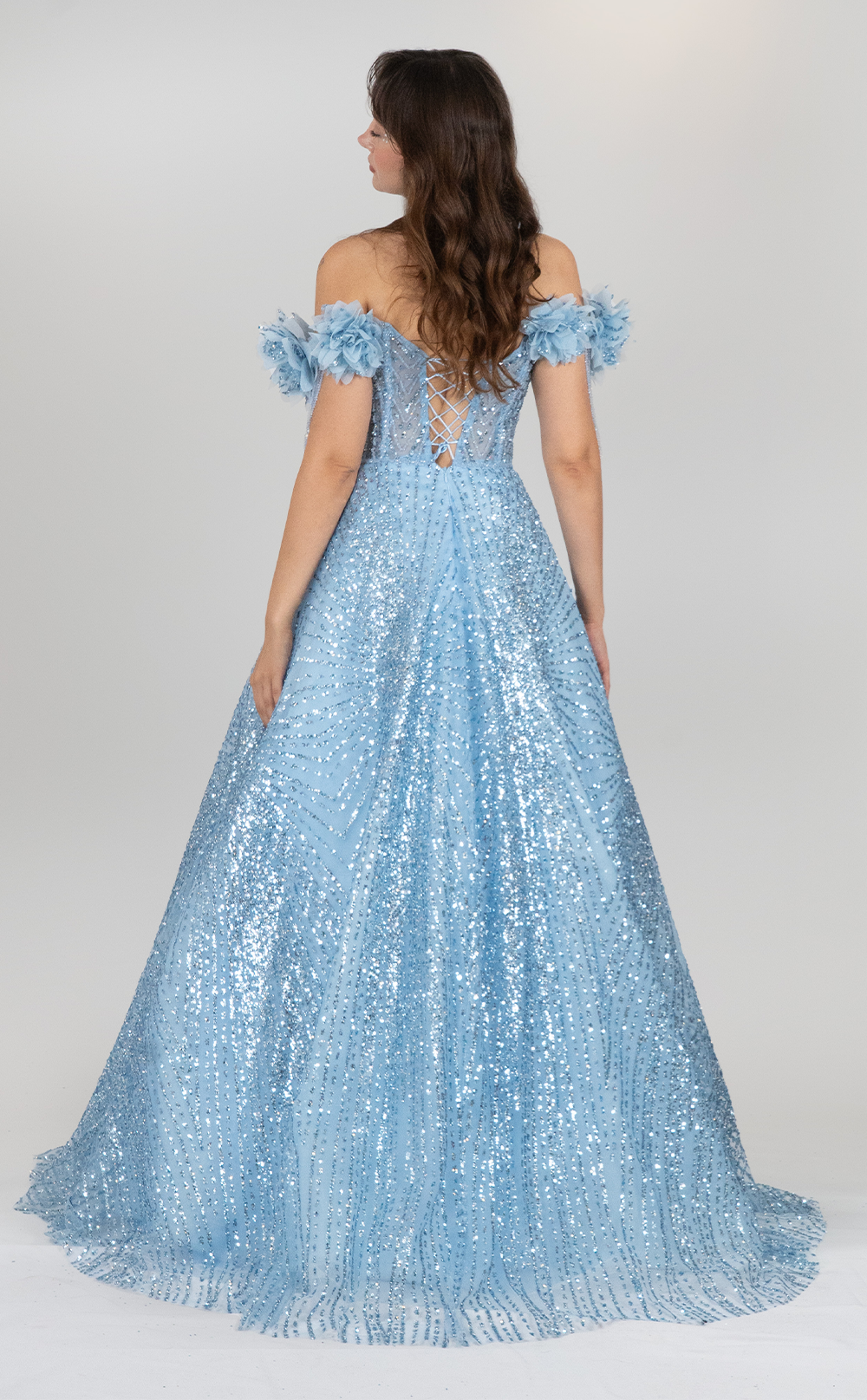 Taşlı Kayık Yaka Bebe Mavi Simli Uzun Abiye